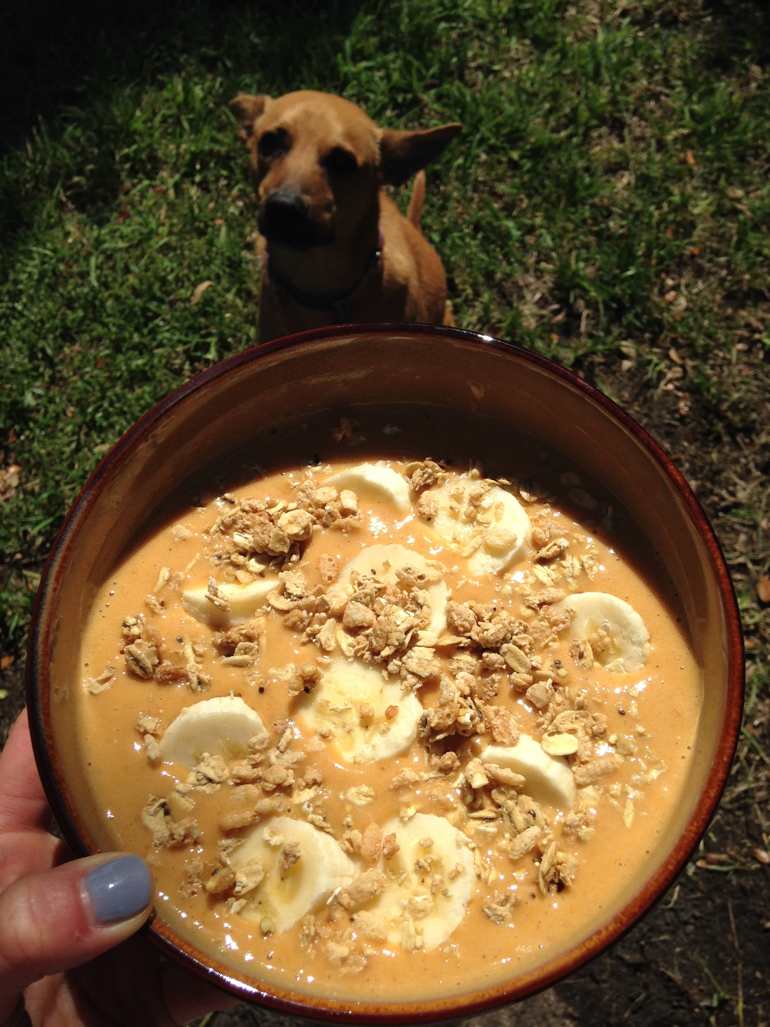 I thoroughly enjoyed my Pumpkin Spice Smoothie Bowl for lunch today while sitting outside on my back patio soaking up the sun and watching my puppy, Addy, play in the yard. I have to share this picture with you that I took of her begging for some of my smoothie bowl - she looked so darn cute and the smoothie bowl looked even more delicious in the sunlight!