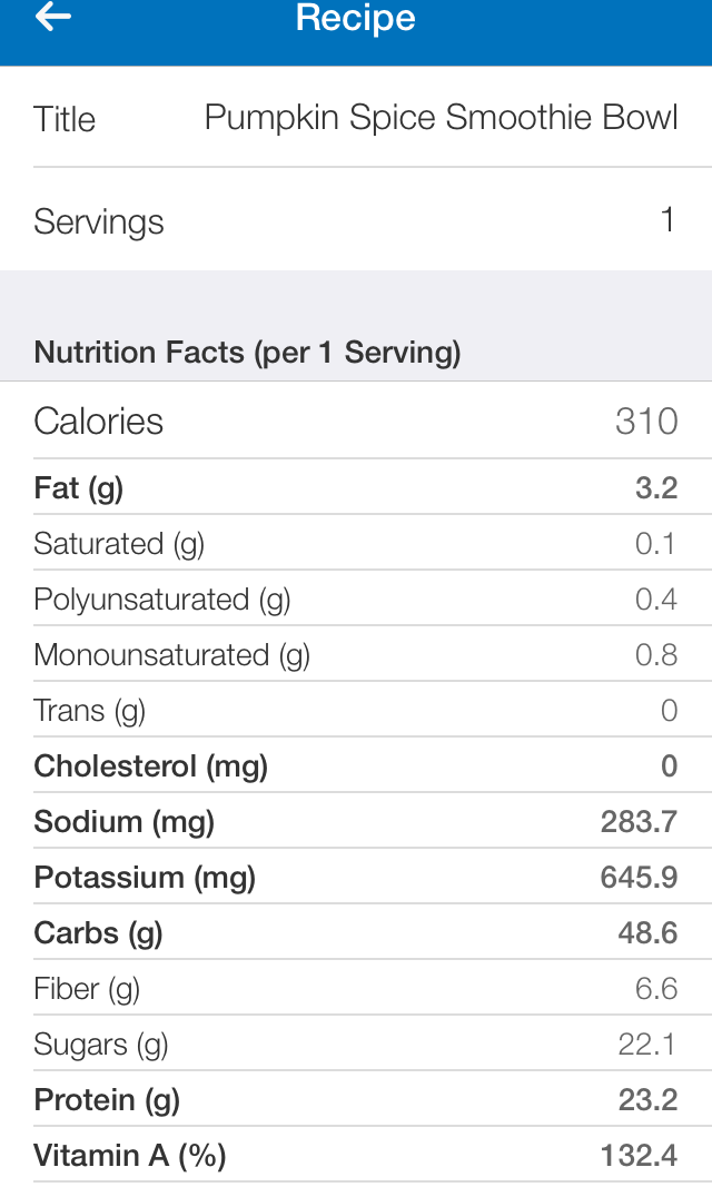 That's all there is to it, my friends! As easy as 1,2,3 and you'll be enjoying a delicious Fall-flavored smoothie that is packed with protein and antioxidants - thanks to BiPro Whey Protein Isolate and Libby's 100% Pure Pumpkin Puree! Just look at this nutrition profile for this smoothie bowl! 1 serving provides 23g of protein and 132% of your daily Vitamin A requirements! Talk about a smoothie that benefits your muscles and your eyesight!